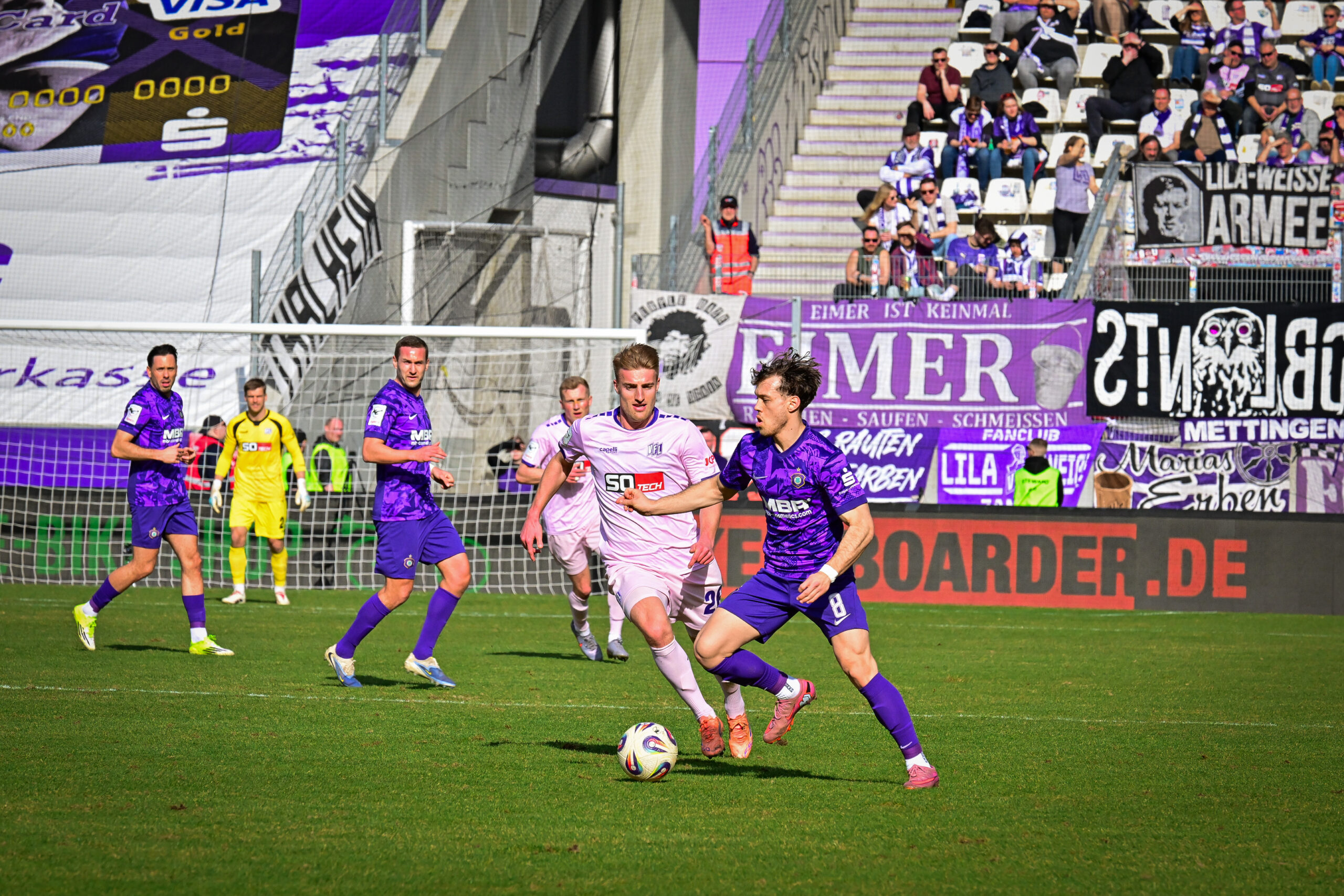 Schon früh in der Partie erlangten die Osnabrücker mit hohem Pressing und klaren Abläufen im Kombinationsspiel die Kontrolle und setzten die Hausherren unter Druck. Bereits nach vier Minuten kam der VfL erstmals gefährlich in den Strafraum der „Veilchen“. Eine flache Hereingabe von Fridolin Wagner verpasste im Sechzehner zunächst Ismail Badjie, leitete den Ball jedoch unabsichtlich auf Frederik Christensen weiter, der in aussichtsreicher Position zum Abschluss kam. Torwart Martin Männel hielt die Kugel jedoch fest (4.). Vier Minuten später ereilte Lars Kehl eine Hiobsbotschaft: Nach einem Zusammenprall mit Eric Uhlmann sah er seine fünfte Gelbe Karte der Saison und fehlt damit im kommenden Ligaspiel gegen Viktoria Köln gesperrt. Feiern durfte der Offensivakteur wenig später dennoch. Denn Ismail Badjie brachte die Osnabrücker – wie schon am vergangenen Wochenende – in Führung. Dabei profitierte das VfL-Eigengewächs von einem Missverständnis in der Auer Defensive. Nach einem langen Ball von Christensen irritierten sich Ryan Malone und Tristan Zobel gegenseitig, sodass das Spielgerät an den beiden Innenverteidigern vorbei in Richtung Sechzehner flog. Badjie schnappte sich den Ball, umkurvte Männel und schob zum 1:0 aus Sicht des VfL ein (17.).