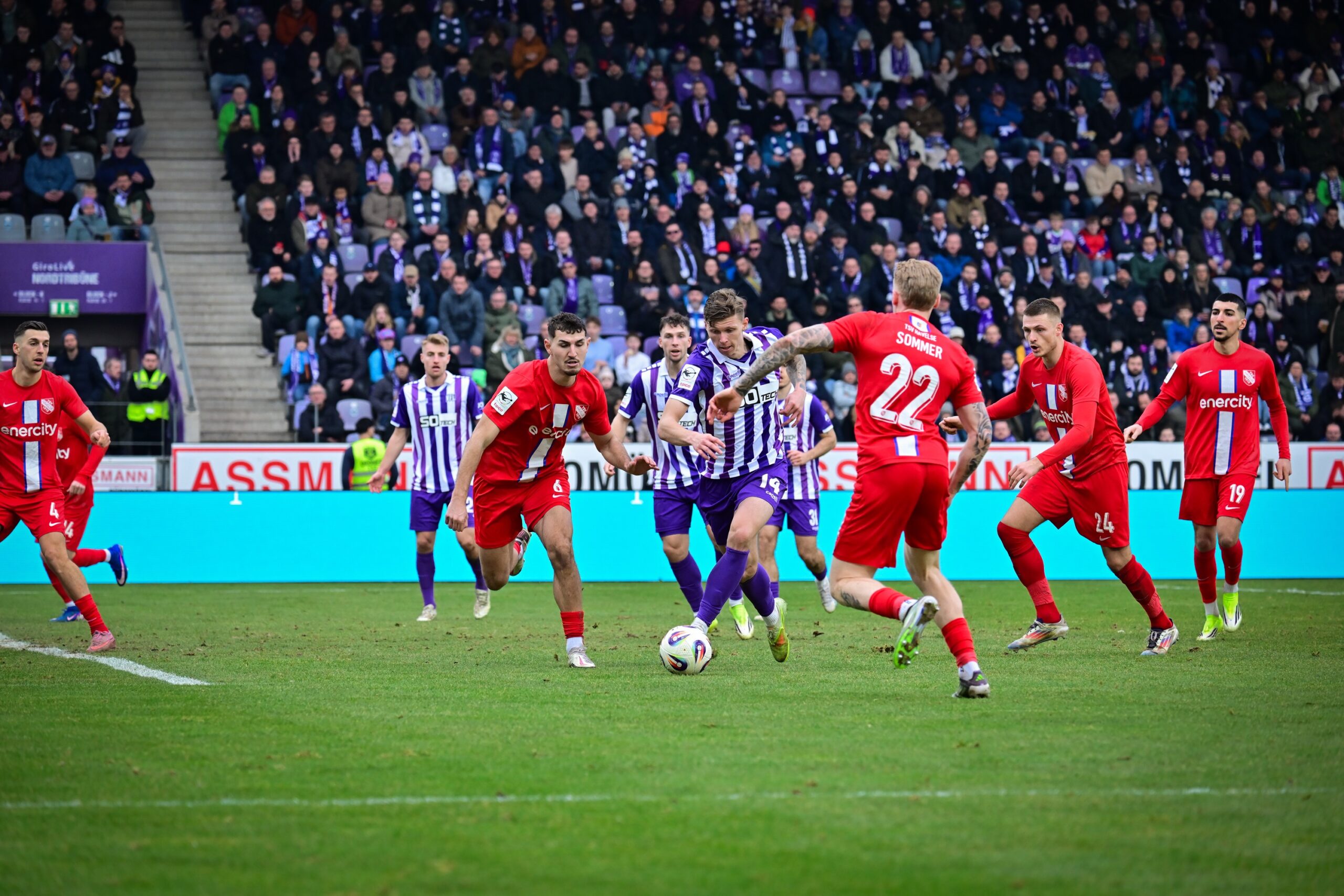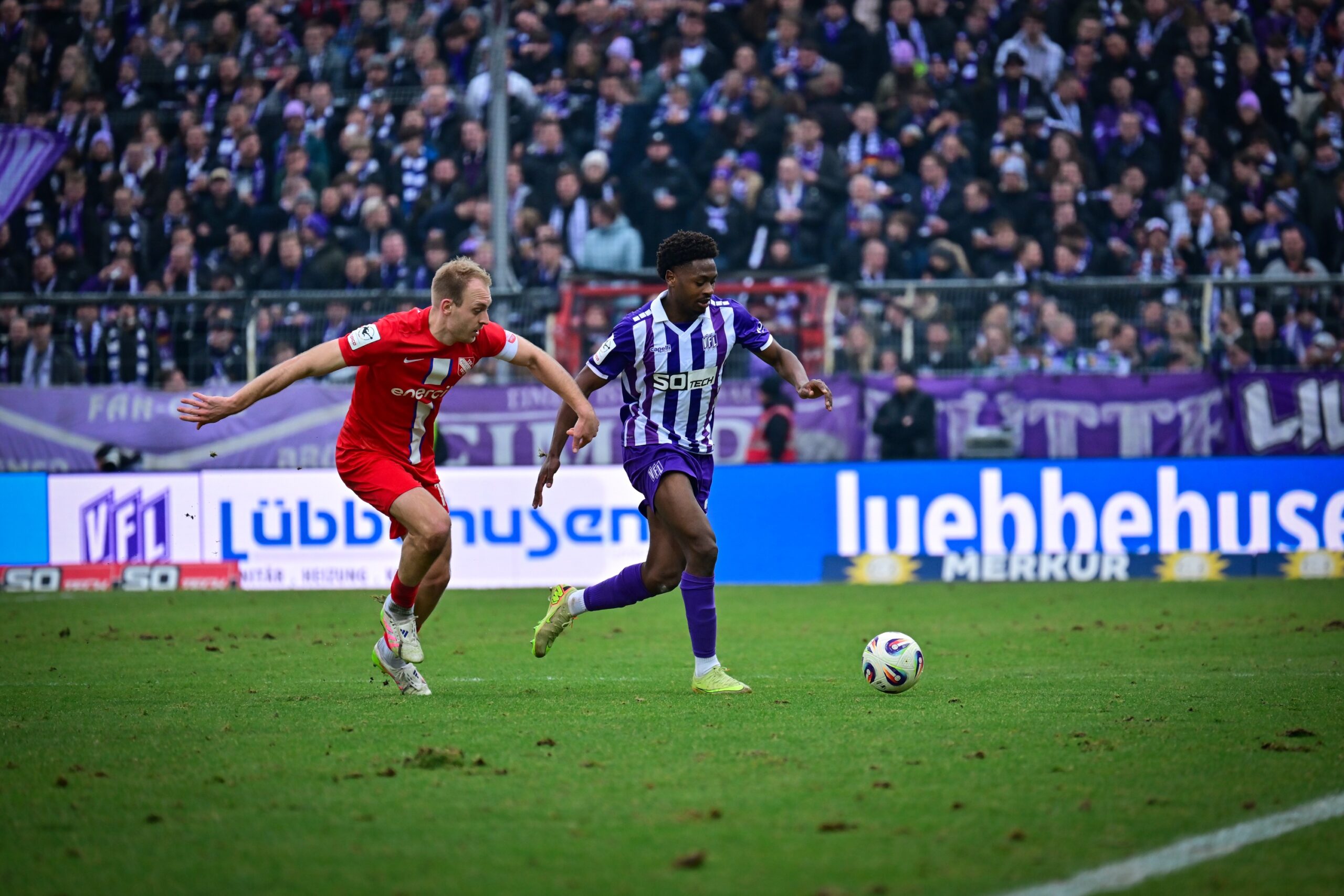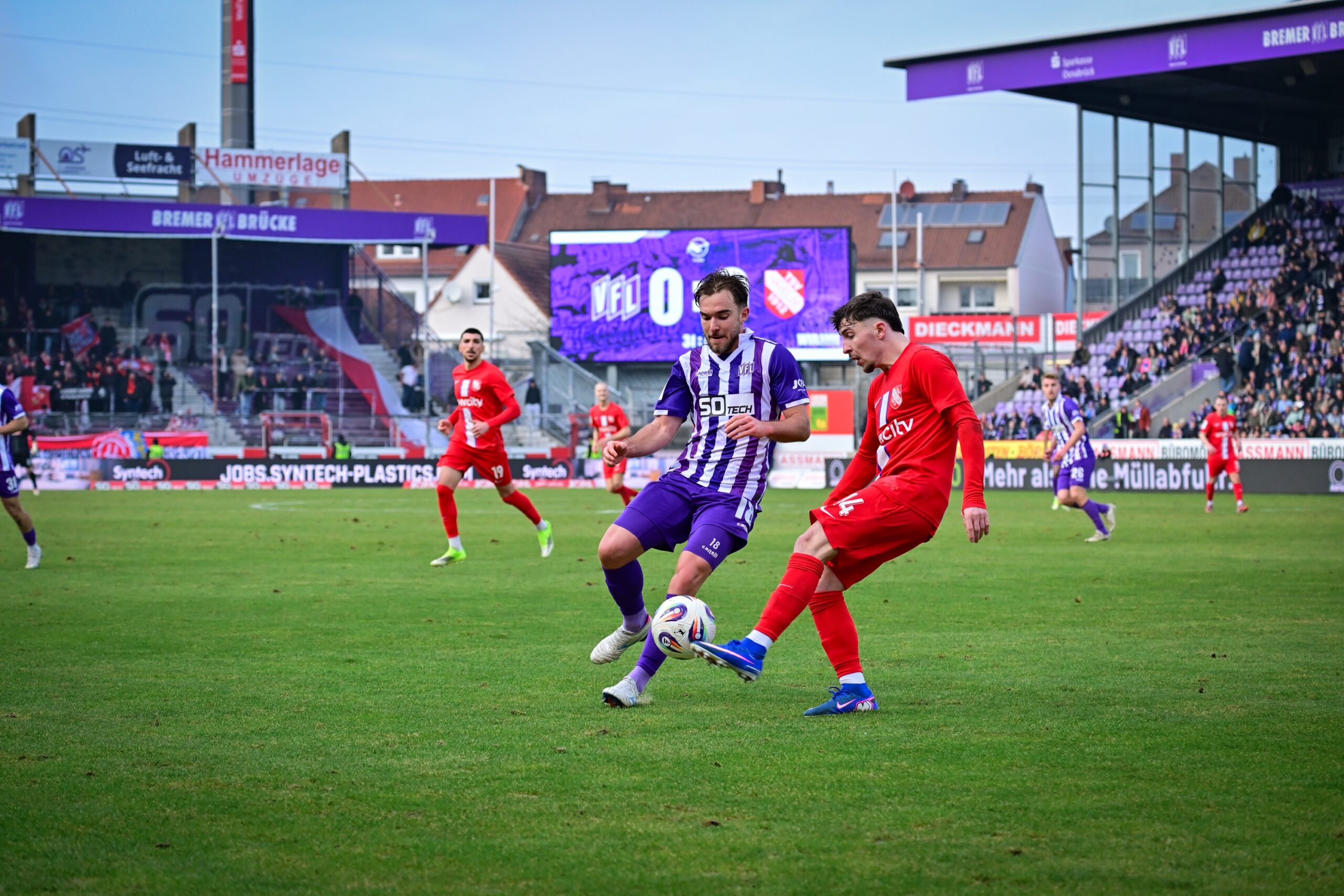 Nach einer Viertelstunde sprangen dann große Teile der 14.037 Zuschauer an der Bremer Brücke von ihren Plätzen, als die Lila-Weißen die hoch aufgerückten Gäste überspielten und Luc Ihorst allein auf das Tor zulief. Keeper Opitz blieb jedoch aufmerksam, stürmte aus seinem Kasten und klärte die Situation mit einer Grätsche (15‘). Mit zunehmender Spieldauer erhöhte der VfL den Druck und wurde nun selbst verstärkt durch Standards gefährlich. So landete ein Freistoß von Lars Kehl auf dem Kopf von Theo Janotta, der den Ball am zweiten Pfosten jedoch nicht mehr auf das Tor setzen konnte (27‘). Auch Kehls direkter Freistoß aus gut 30 Metern, den er scharf an der Mauer vorbei auf das Tor zog, fand in Opitz seinen Meister, der stark parierte (30‘). Trotz klarer Feldvorteile verpassten die Lila-Weißen somit den verdienten Führungstreffer, sodass es torlos in die Kabinen ging.