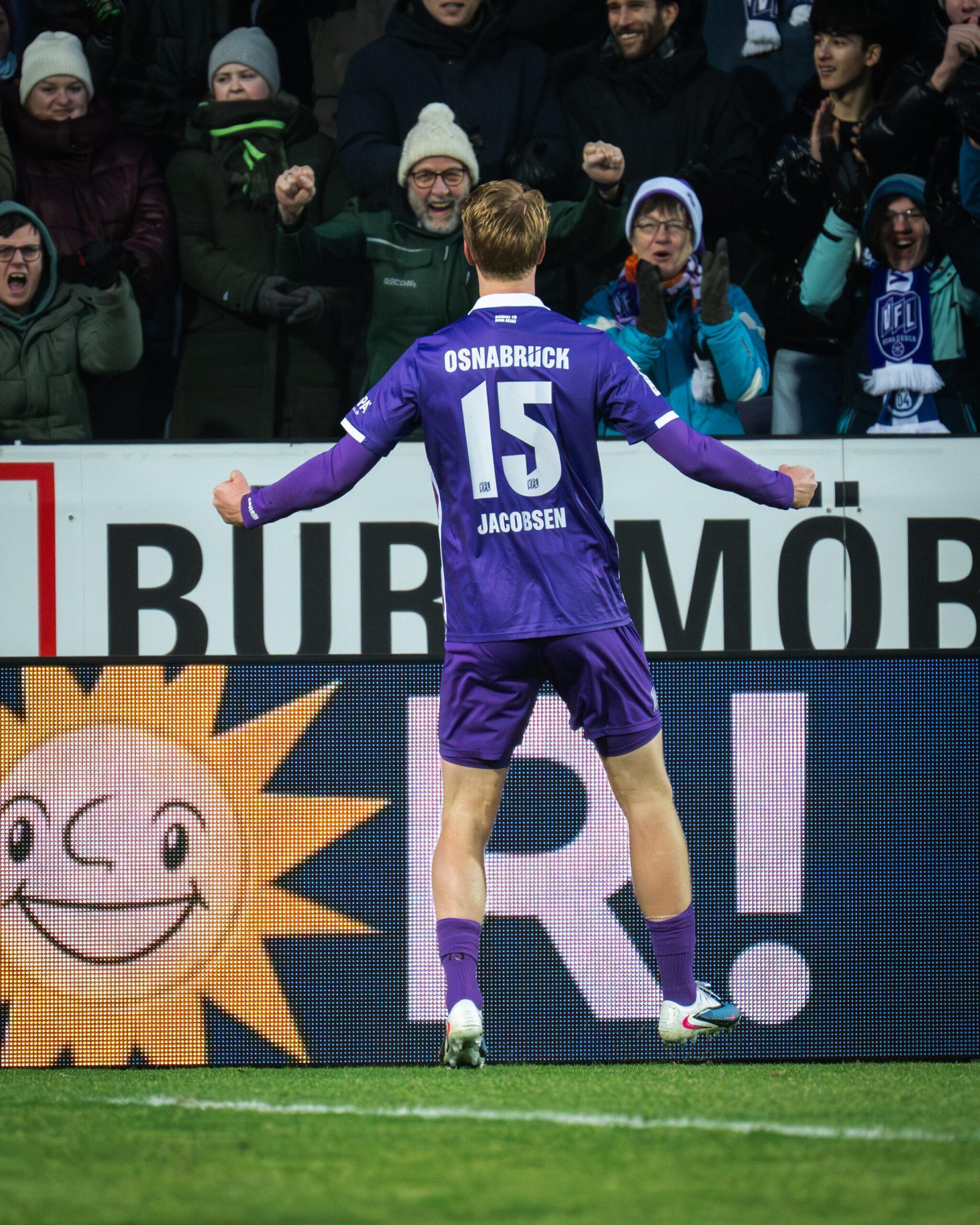 Im mit 15.369 Zuschauern besetzen Stadion an der Bremer Brücke dauerte es nicht lange, bis die Lila-Weißen den ersten Torabschluss der Partie verbuchten. Nach einem Freistoß landete der Abschluss von Niklas Wiemann aus der zweiten Reihe allerdings deutlich über dem Tor von Keeper Thomas Dähne (2‘). Generell übernahmen die Osnabrücker früh das Spielgeschehen und wurden schließlich durch einen Standard erfolgreich. Lars Kehl, der am Sonntagnachmittag viele gute Eckbälle schlug, brachte in der 17. Minute einen Eckstoß punktgenau auf den Kopf von Bjarke Jacobsen, der das Spielgerät im langen Eck platzieren konnte (17‘).