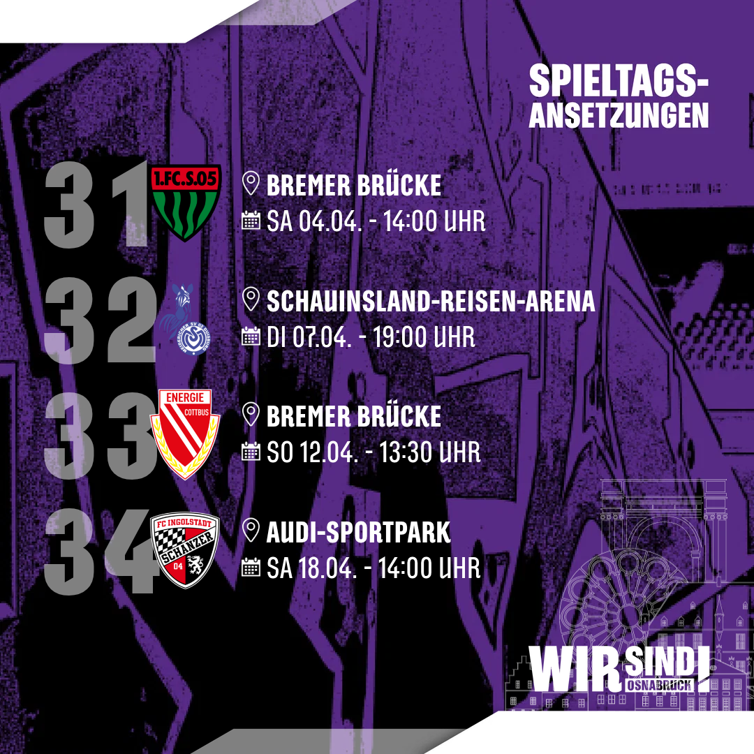 Am Osterwochenende empfangen die Lila-Weißen am Samstag, den 4. April, den 1. FC Schweinfurt in Osnabrück (Anpfiff: 14:00 Uhr). Nur drei Tage später reist die Mannschaft von Cheftrainer Timo Schultz am Dienstag, den 7. April, in die Schauinsland-Reisen-Arena zum Topduell gegen den MSV Duisburg (Anpfiff: 19:00 Uhr). Zum Ende der englischen Woche kommt der FC Energie Cottbus, am Sonntag, den 12. April, an die Bremer Brücke (Anpfiff: 13:30 Uhr). Eine Woche später reisen die Osnabrücker schließlich, am Samstag, den 18. April, zum FC Ingolstadt in den Audi-Sportpark (Anpfiff: 14:00 Uhr).